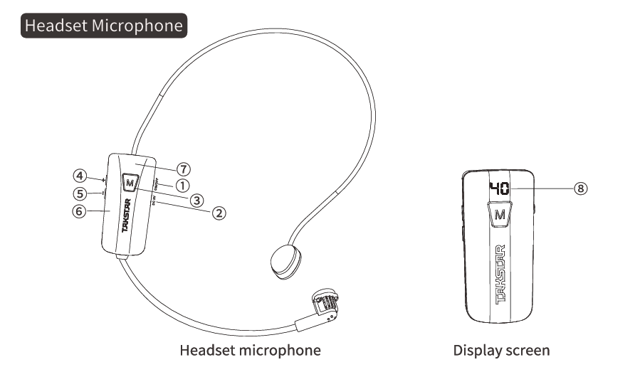 ⑤ Nút “∨”: Nhấn để giảm âm lượng mic; trong chế độ ghép đôi với loa trợ giảng Takstar E261W Gen 2, nhấn một lần để chuyển sang kênh tần số tiếp theo, nhấn giữ để nhảy kênh tần số nhanh.