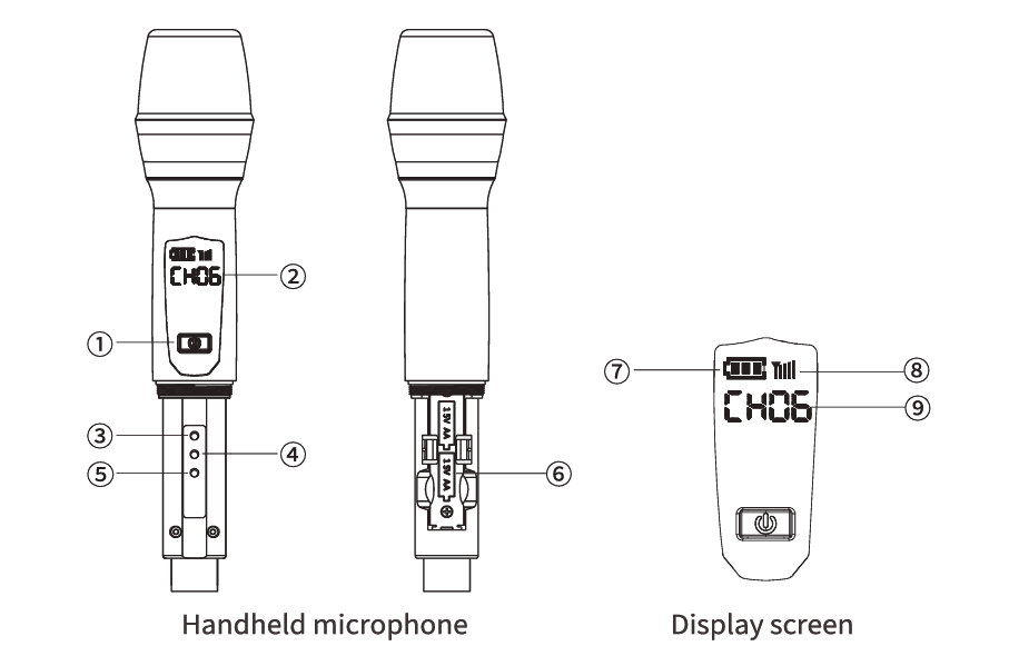 ⑧ Kênh làm việc/Âm lượng Mic: Hiển thị kênh làm việc hiện tại (01-50); hiển thị mức âm lượng (U1-U6) khi nhấn các nút âm lượng. Màn hình tự động tắt sau 10 giây không hoạt động.